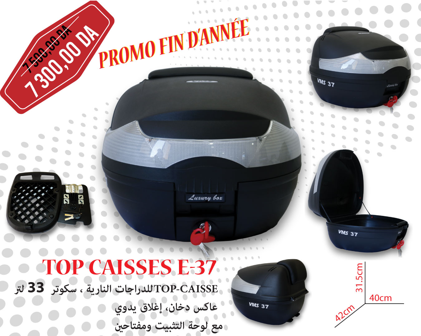 Ne laissez plus le manque d’espace limiter vos aventures à moto ou en scooter. Optez pour la Top Caisse E-37 et profitez d’un rangement pratique, d’un design attrayant et d’une sécurité renforcée. Commandez dès maintenant et transformez votre expérience de conduite en toute tranquillité.